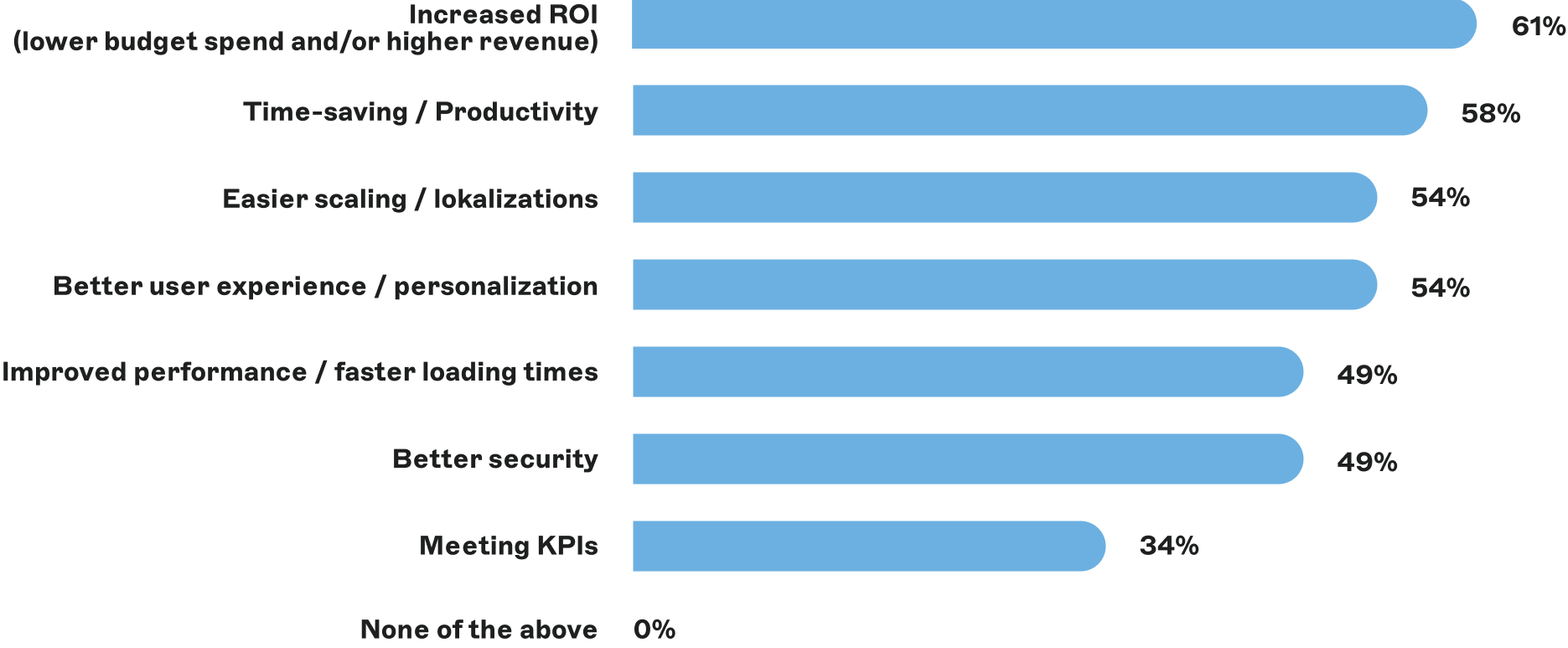As for the German users who have switched to headless? It’s paid off, big time: 70% reported increased ROI, alongside other benefits including easier scaling/localization (58%) and timesaving/productivity improvements (40%). Only one person reported no benefits to headless.